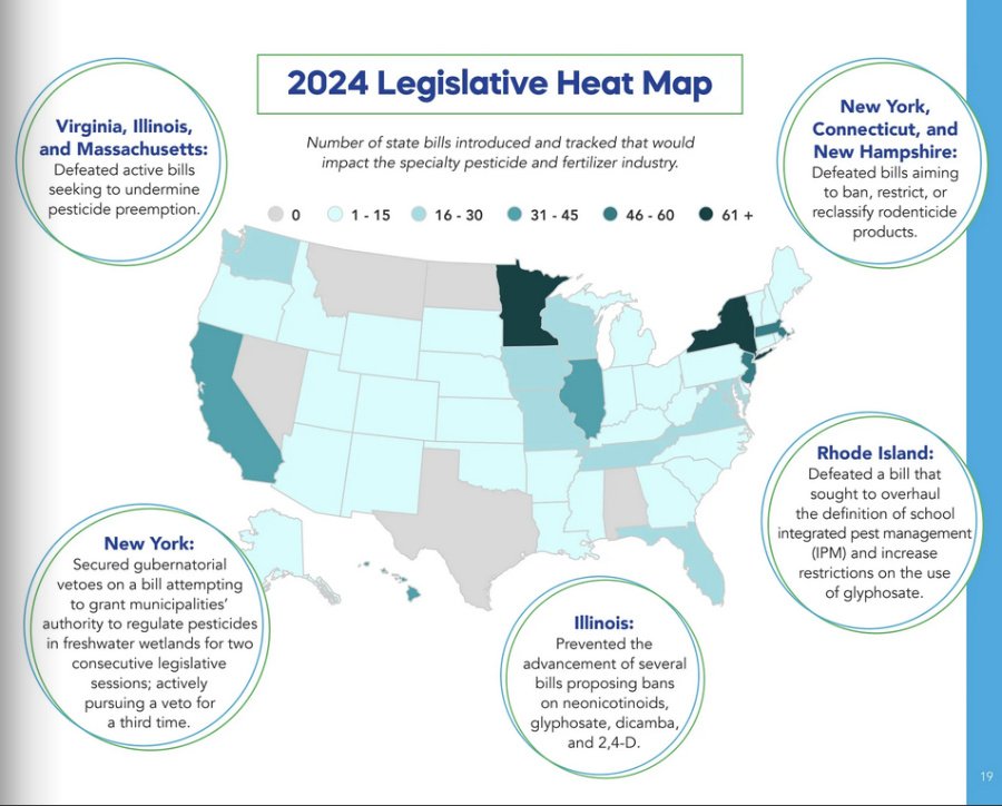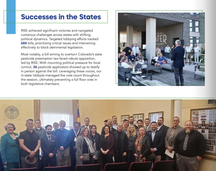 The Colorado bill failed to gain traction, and RISE touted its role in its 2024 annual report: “With mounting political pressure for local control, 36 pesticide applicators showed up to testify in person against the bill. Leveraging these voices, our in-state lobbyist managed the vote count throughout the session, ultimately preventing a full floor vote in both legislative chambers.”