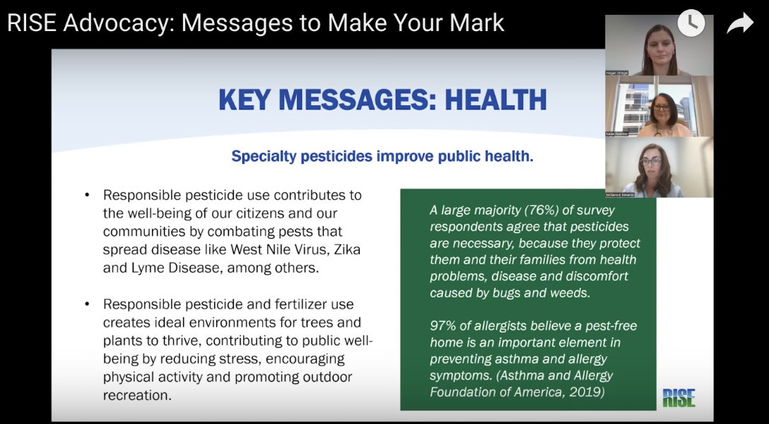 The messages had been developed using RISE public survey results and tested for resonance. They are also prominent on RISE’s public-facing website. They include that pesticides improve quality of life by enabling green spaces like athletic fields and by eliminating invasive species, and that they benefit public health by controlling disease-carrying insects like mosquitos and ticks.