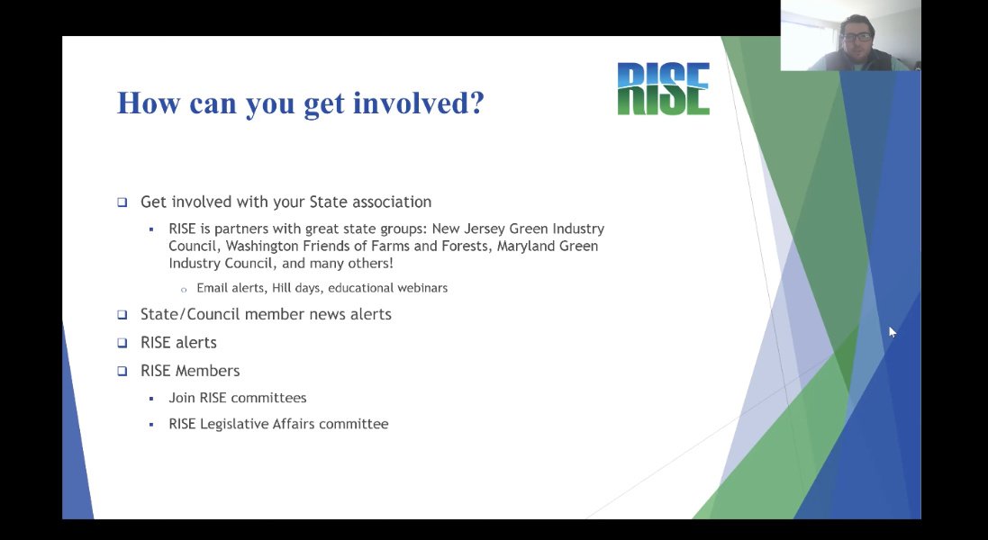 A screenshot from a RISE webinar spotlighting the key messages the group asks their network of advocates to use when communicating with policymakers.A screenshot of a RISE webinar with Jon Gaeta showing how members of the group's advocacy network can get involved.