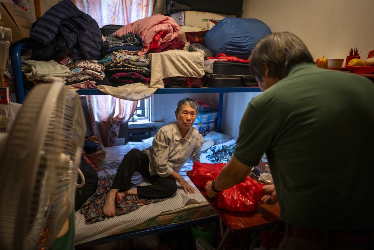 Choo Tung in her home, with a fresh delivery from the Senior Center. Some seniors Ng visits have lost spouses and say they want to remarry or find new partners, and ask her for help in meeting people. Ng encourages them to come to the center so that they might make new friends.