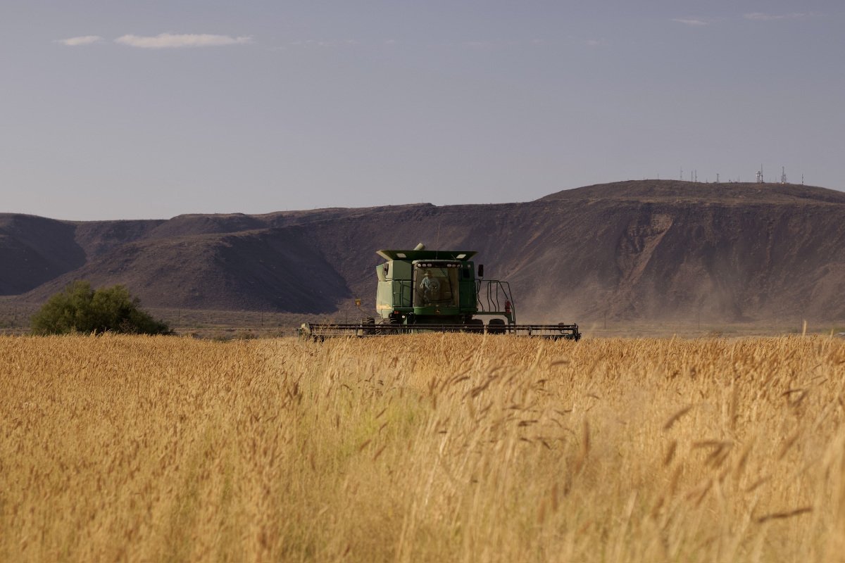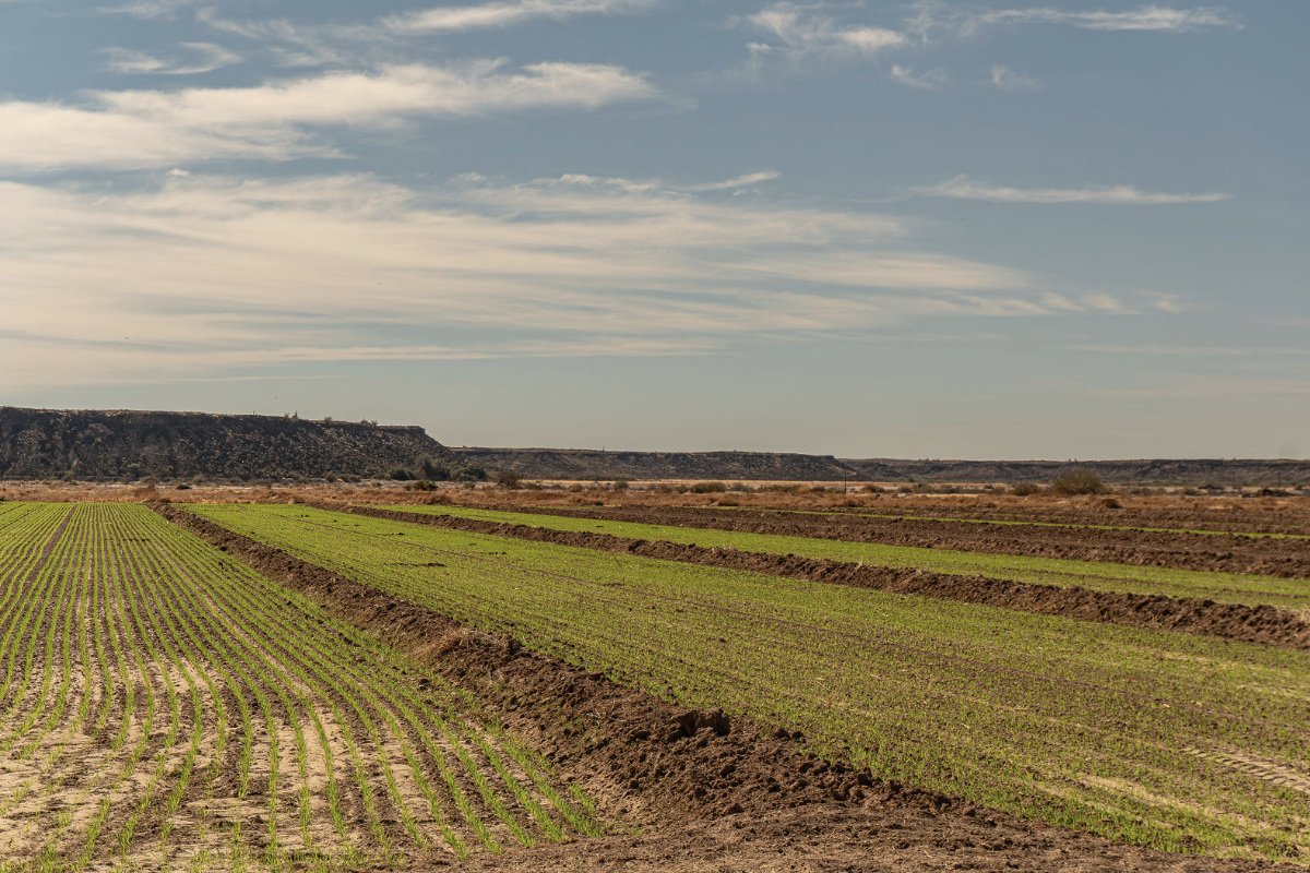 Sonora wheat, barley, and other desert-hardy crops stretch along the now-dry Lower Gila River valley at Oatman Flats Ranch. (Photo credit: AJ Ledford)