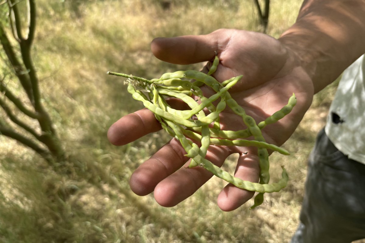 Farm manager Yadi Wang with a handful of mesquite pods picked from a tree near the farmhouse. The mesquite pods are dried and ground into a gluten-free, nutrient-dense flour. (Photo credit: Samuel Gilbert)