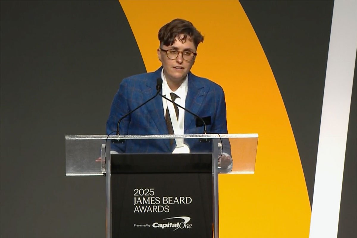 Former Staff Reporter Grey Moran accepts a James Beard Foundation Media Award on Saturday for their win in the Health and Wellness category.